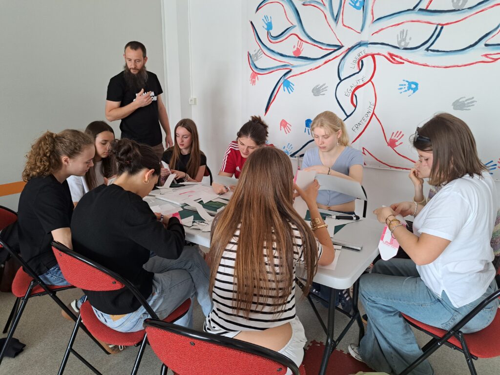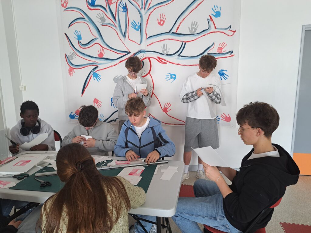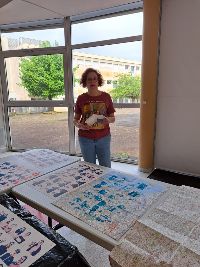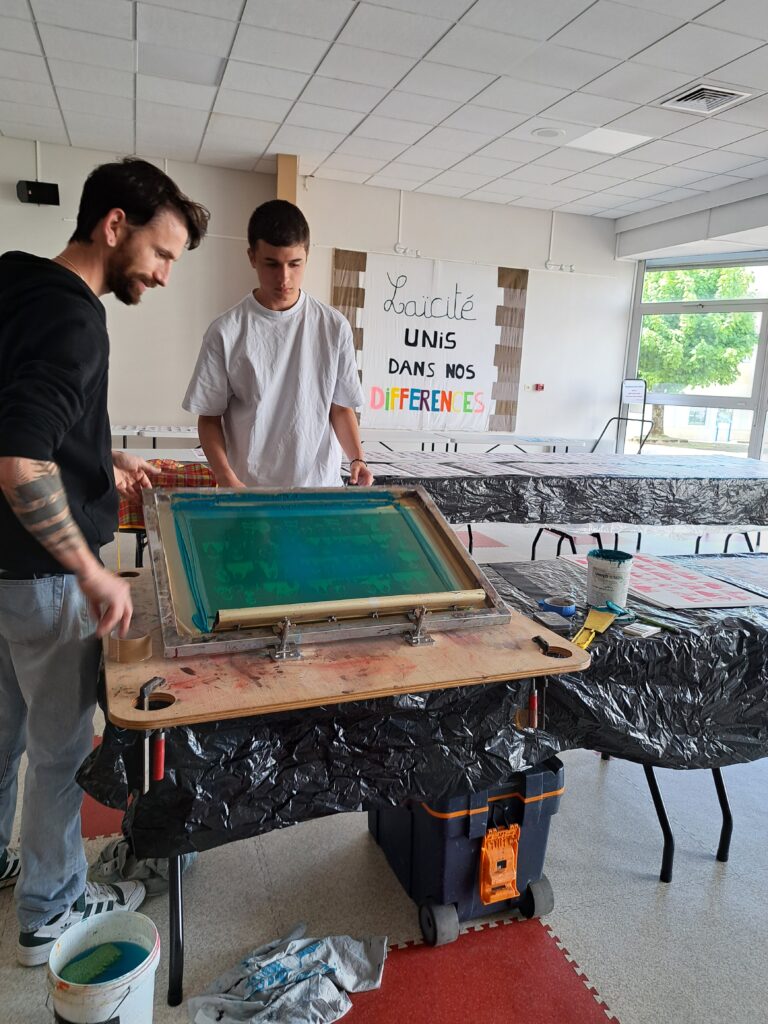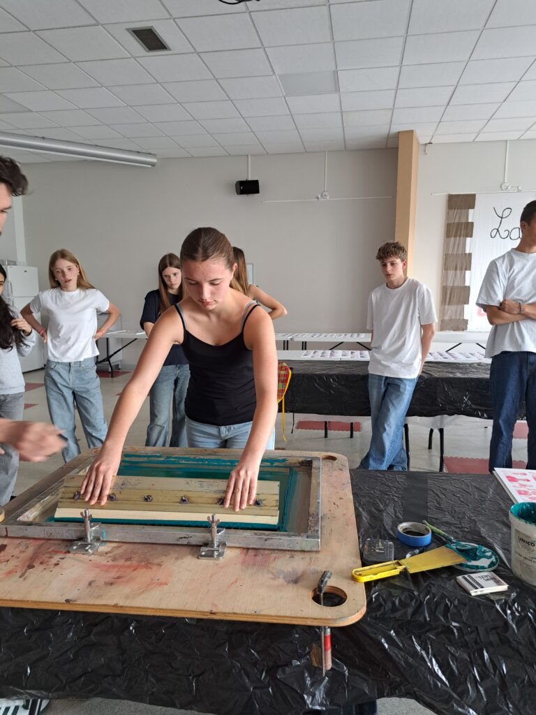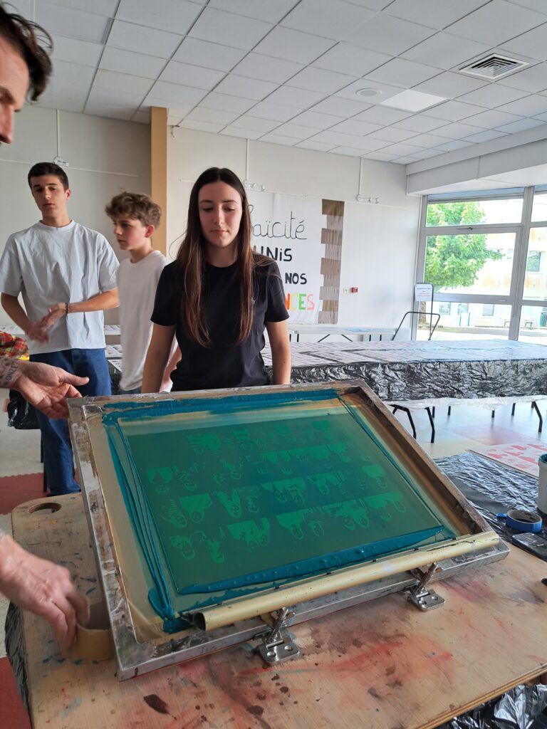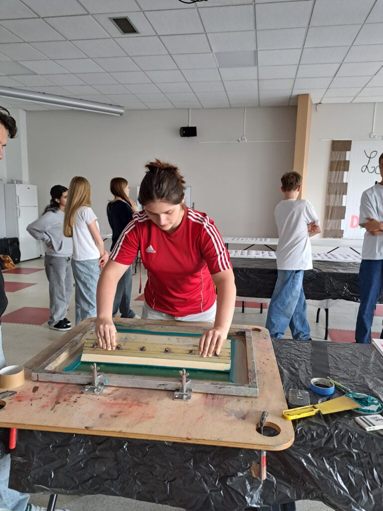 Ce jeudi nous avons travaillé ensemble sur le projet de sérigraphie, grâce au savoir-faire de la compagnie « Les Mains Sales », basée à Angoulême. Chacun a pu réaliser un poster composé des photos des différents binômes franco-allemands qui avaient été prises lors de notre séjour à Gießen en mars dernier. Il fallait réaliser un passage à l’encre bleue sur un poster préimprimé en rose, à travers une trame de tissu, à la façon d’un pochoir.